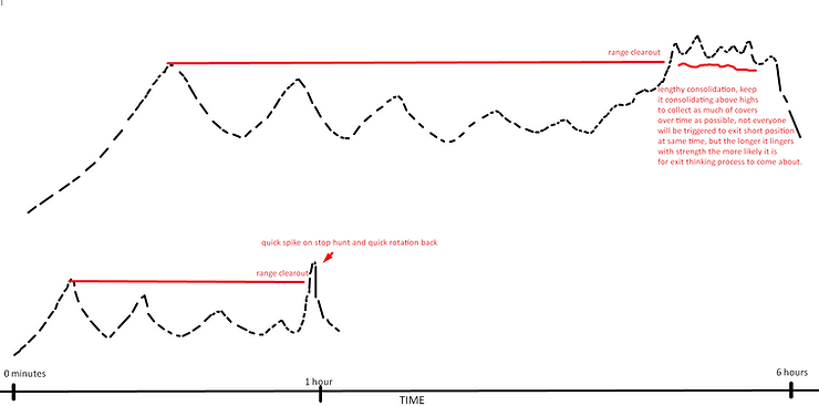 There are basically two different processes on smaller structure (less time); the aim is just a stop hunt of stops that sit above the major highs. In contrast, on lengthy consolidation, the aim is two-fold: stop the hunt, and the second is to collect covers over time slowly since there is more liquidity participating.