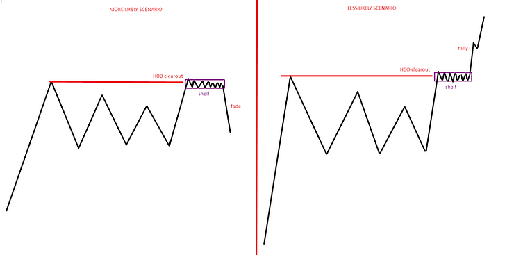 One statistically relevant variable that matters to point out is that if there is a shelf formed after successful HOD clearout, this will put a high chance of price fading lower after shelf and not rallying. Statistically, it happens much more rarely that price would rally from the formed shelf, especially if the tape is confirming large seller present. In more cases, shelf results with fade instead (if it is well expressed).