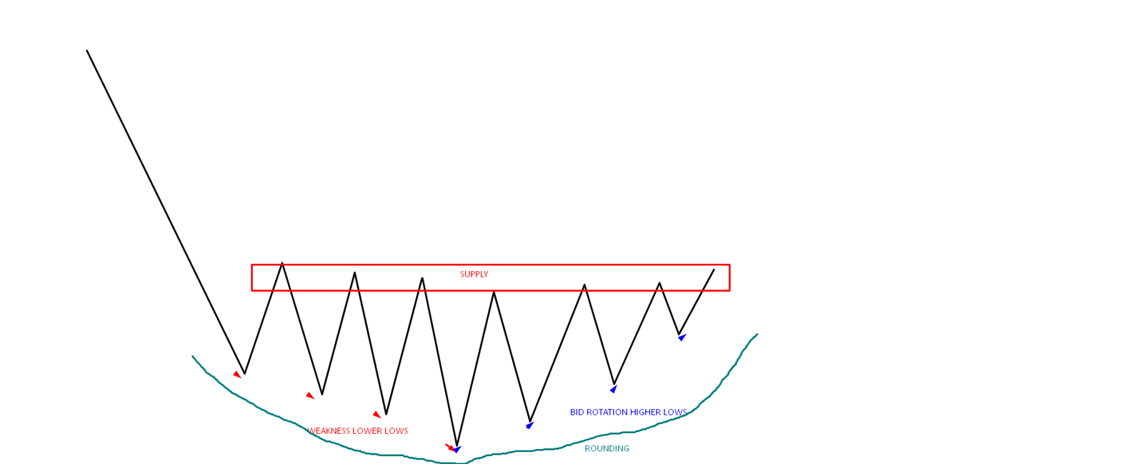 Example of symmetrical supply level and clean progression of higher lows into the supply level (ideal variable), cleanly indicating that buyers are trying to absorb the selling supply with pressure upward.