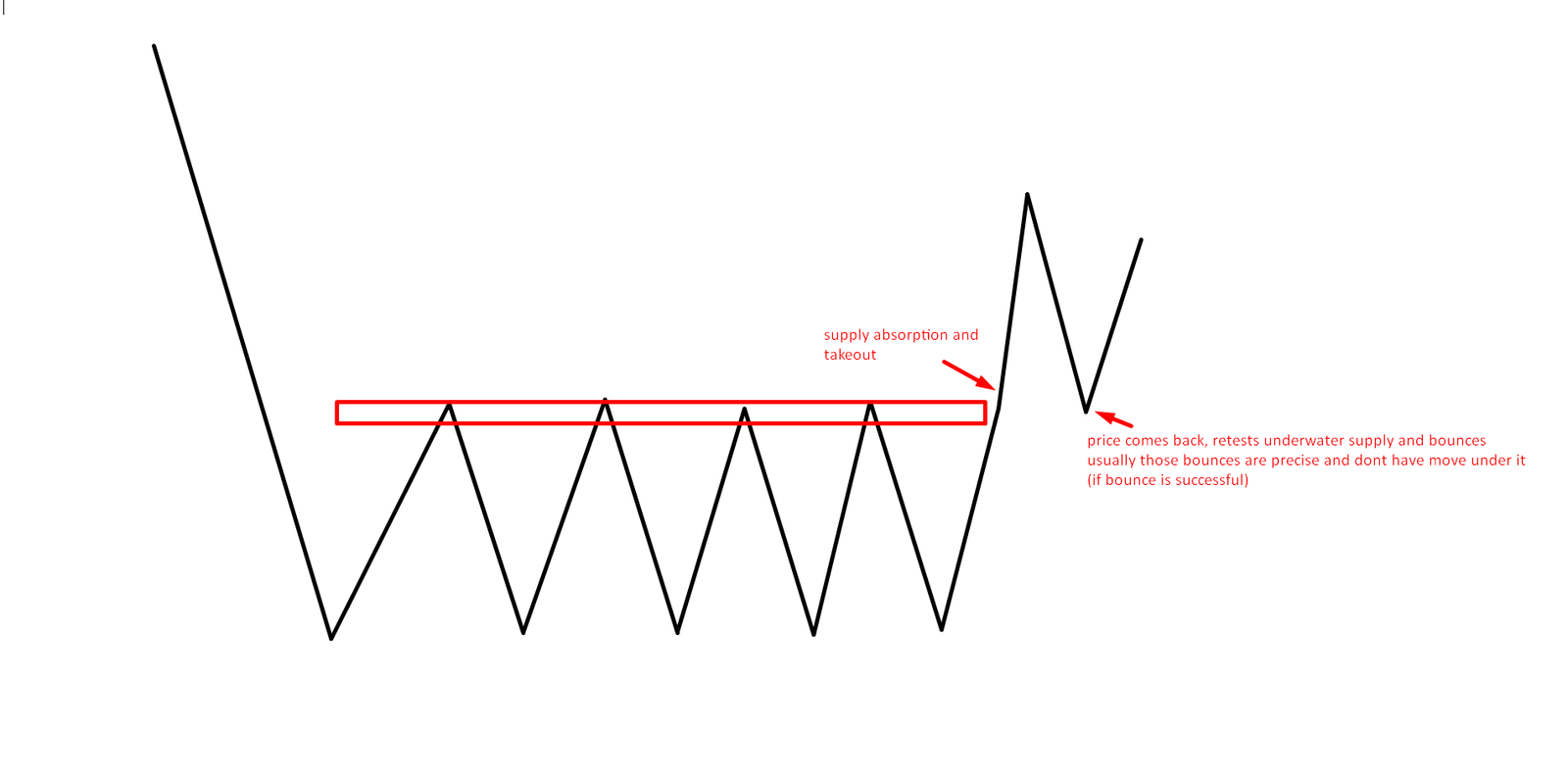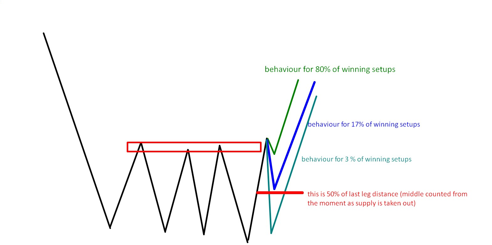 There is an overall decent chance that if supply takeout is successful and delivers a push upward after breaching the supply, the price will bounce if that same supply level is retested to the downside, in about 60% cases, the price re-tests that supply. A trader can use that area for a potential long entry play zone. Those re-tests and bounces can often be quite sharp and accurate, with price cleanly bouncing from major underwater resistance up to almost no under-over move. But that is not always the case; this is, however, common behavior in successful bounces.