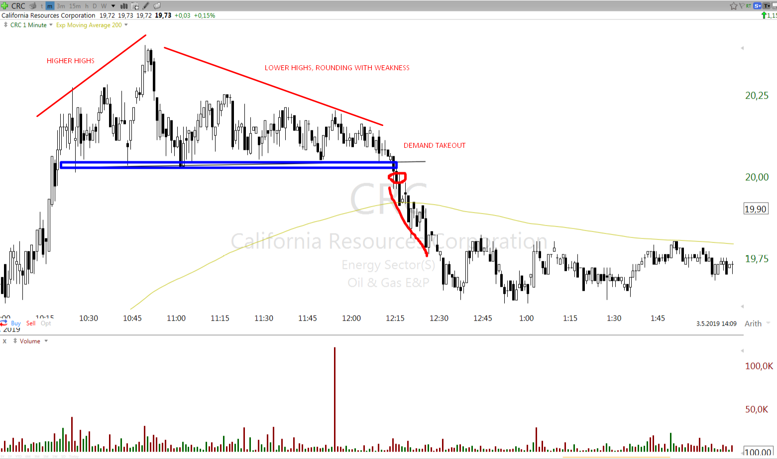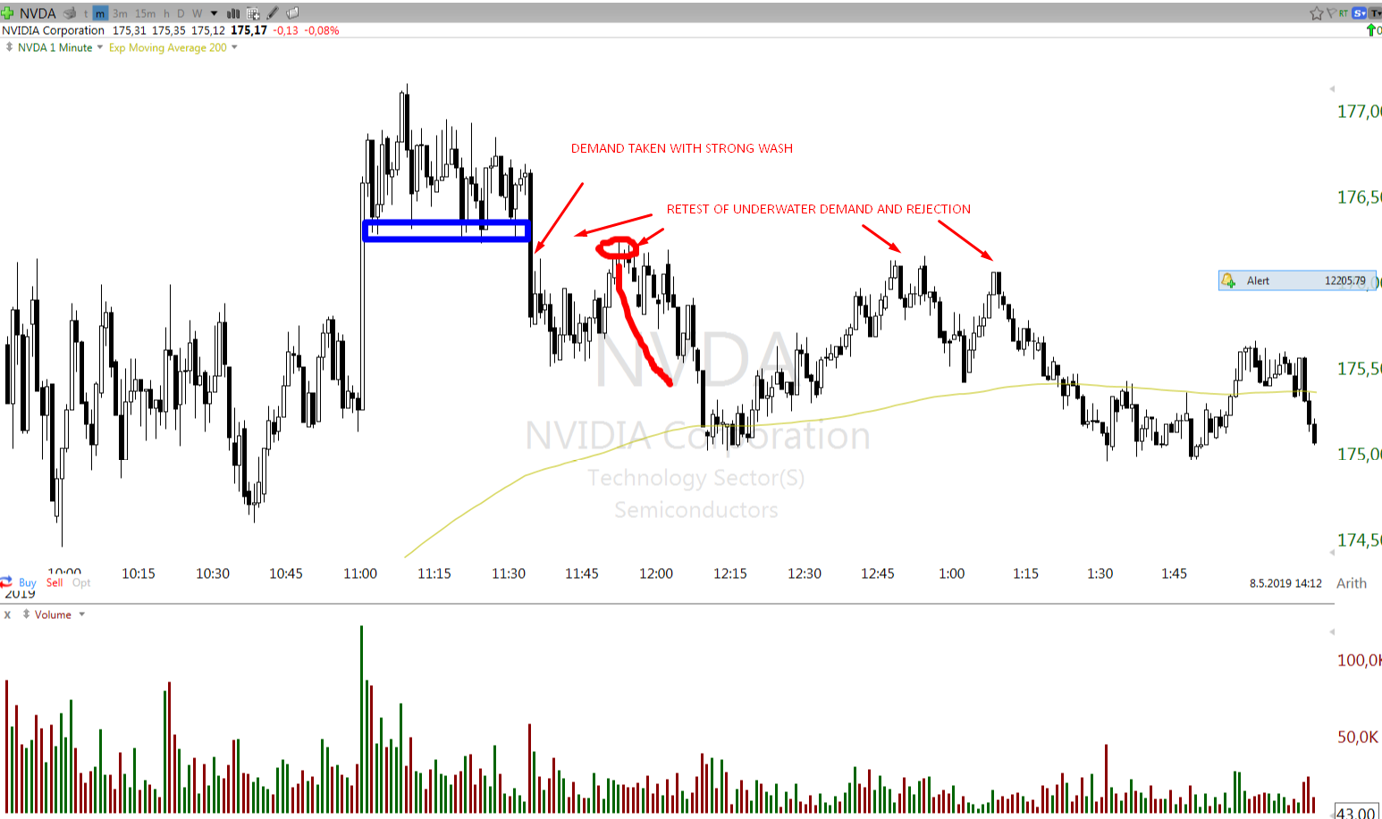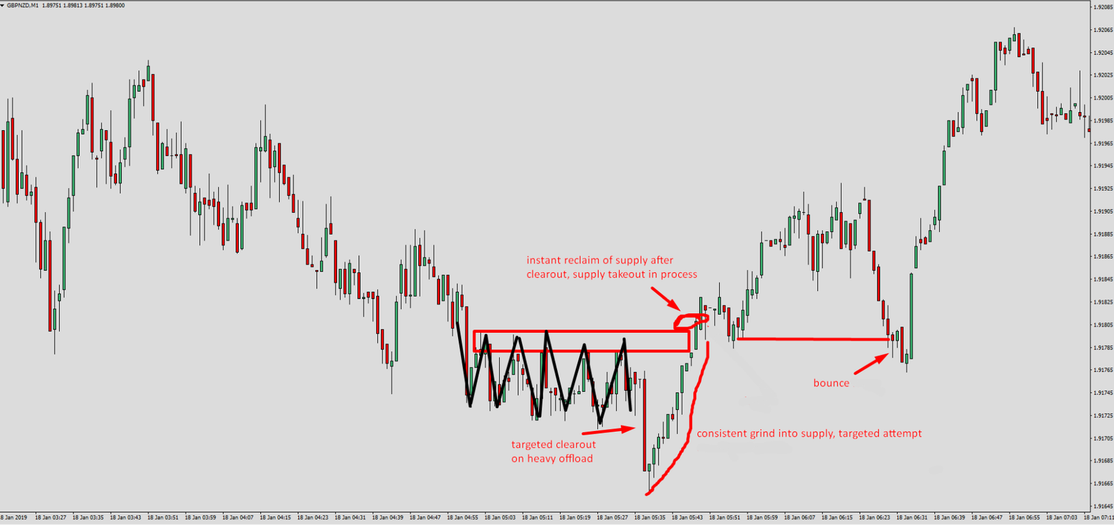 Example of demand takeout, followed by a retest of underwater demand and rejection twice of the same level.