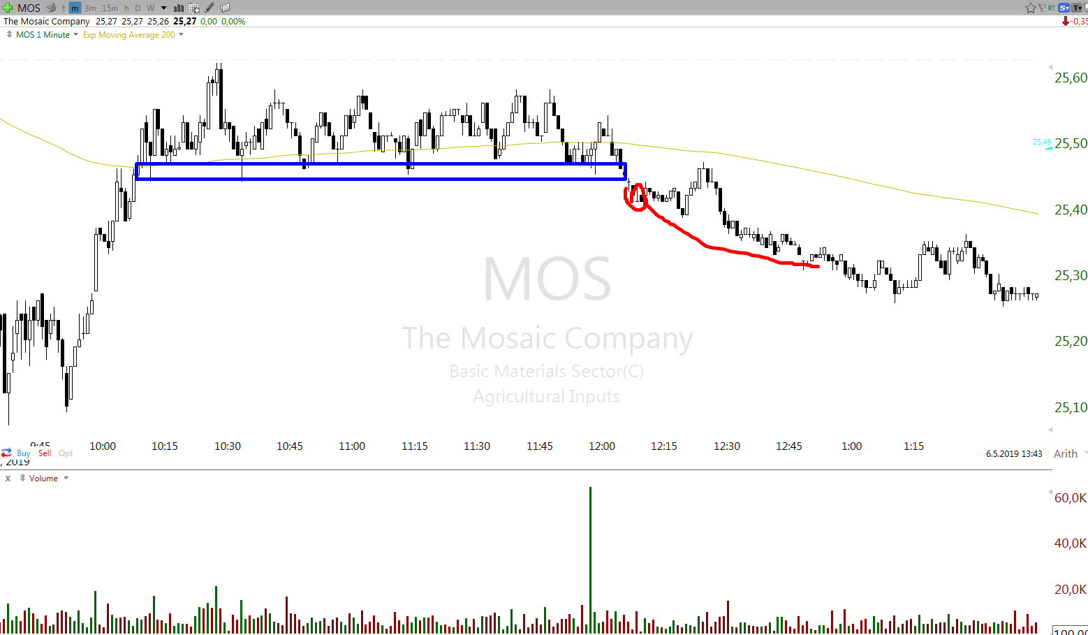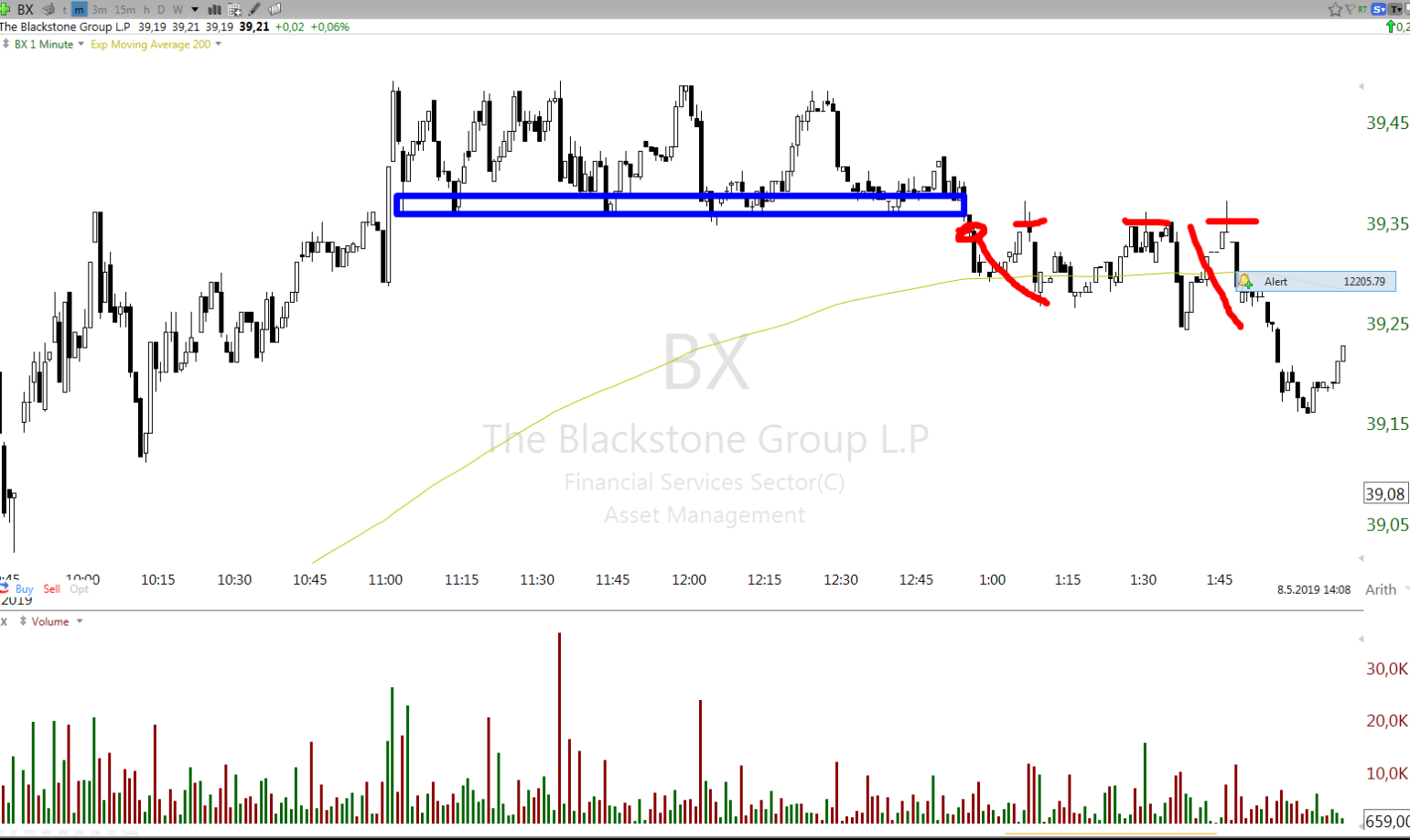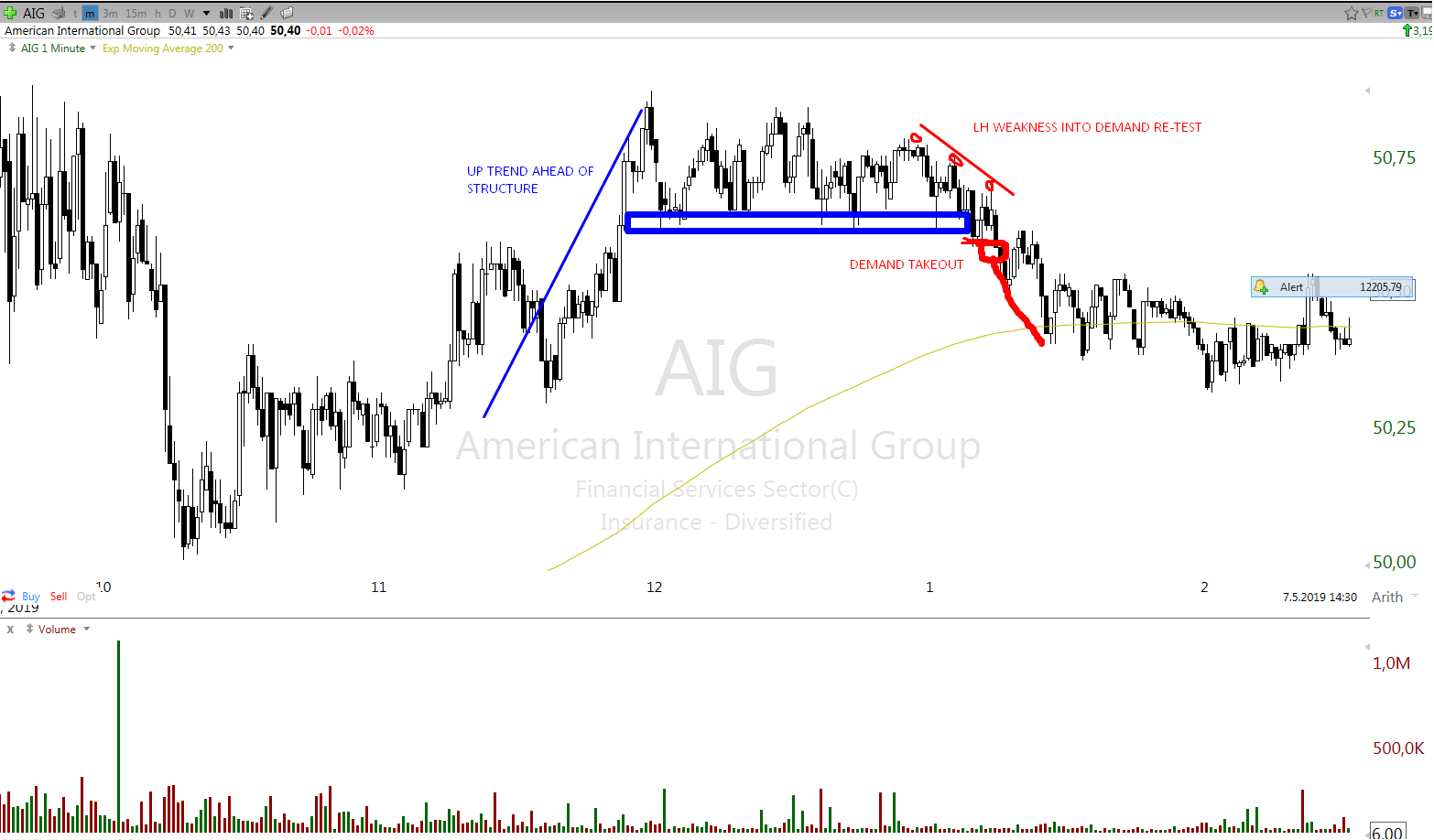 Example of demand takeout on ticker AIG, followed by slower selloff after the key level is breached.
