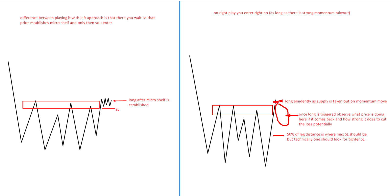 Bellow is the conceptual presentation of trade management on setup (left setup with micro shelf for very tight risk, right normal – typical setup with slightly looser risk):
