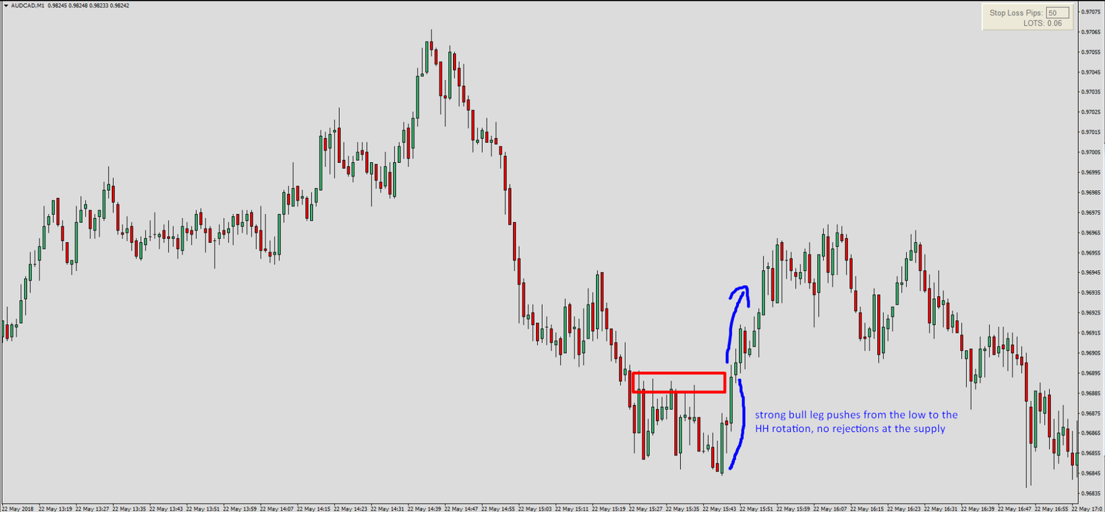 The last leg that setup takes out the supply is crucial, it should be a powerful move; the market maker needs to reveal their hand and show strong initiation. There is no point trading those setups without strong demand shift because otherwise, the trader is doing too much guesswork on what price might do after it passes through the supply. Thus last leg move (the one where price breaks supply) should be very strong and possibly on solid volume, or at least it should form a micro shelf at the supply area, showing that buyers are constantly soaking up offers at supply. The tape should confirm strong buying at the ask, showing aggression of the market into offers. If the last leg is not strong, a trader should avoid taking a trade.