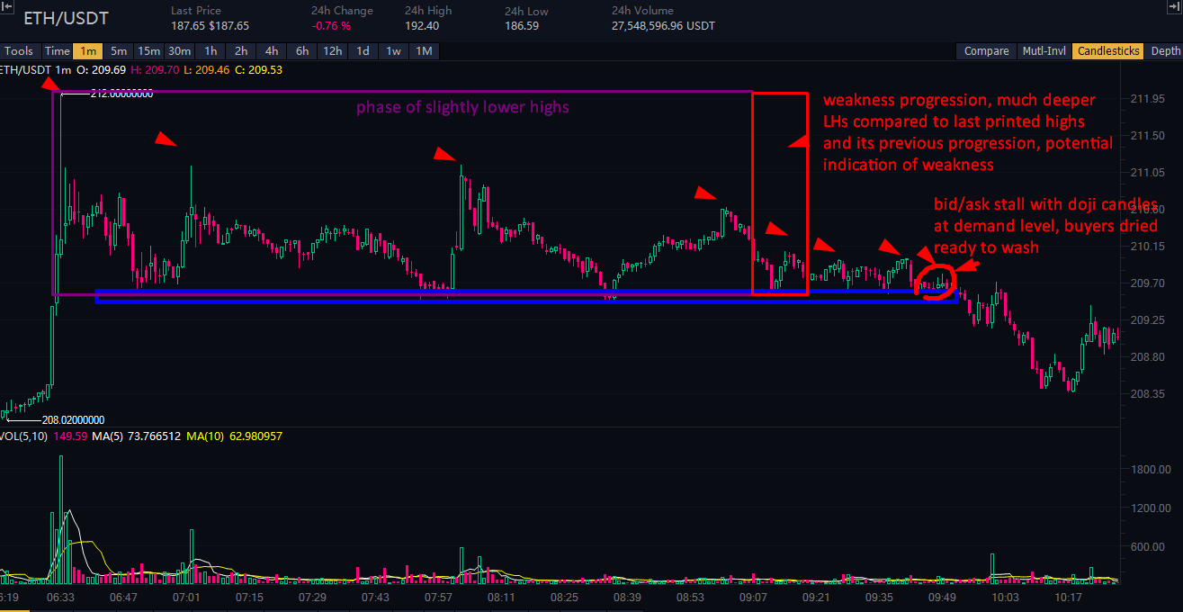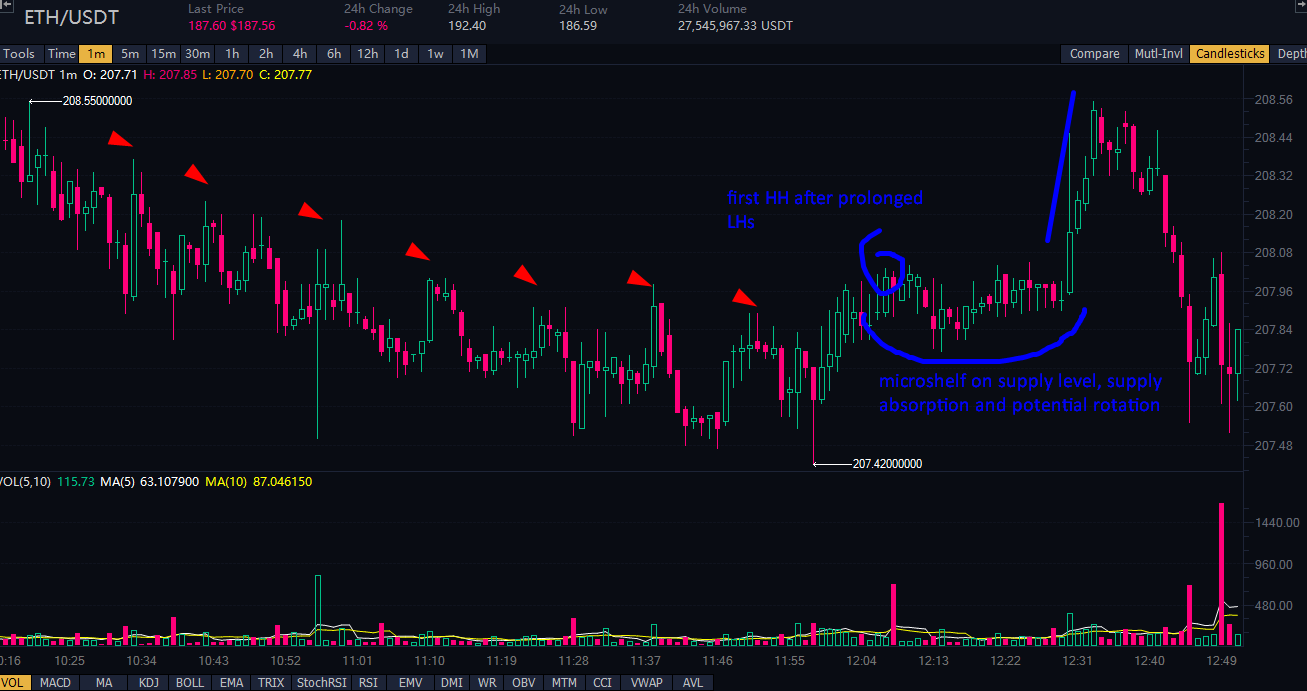 Supply absorption in downtrend rotation on the example below on crypto ticker Ethereum. When price behavior becomes very consistent with consistent lower highs progression, it is easier to note from the price and tape when rotation takes place (downtrend into the uptrend) , because it is easier to isolate variables of micro rotations such as higher lows stepping up into offers or supply.