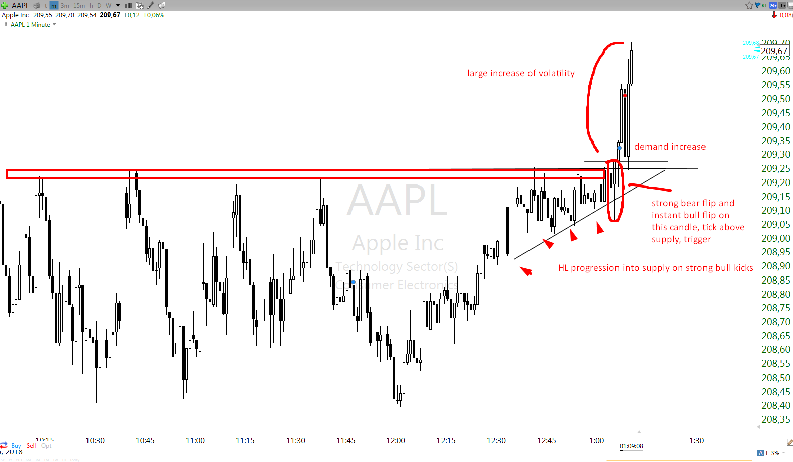 On image example of ticker AAPL with large depth of supply structure, and then micro shelf build-ups into supply, consistent absorption of offers, until all offers were soaked and price popped higher quickly. This is ideal of how supply takeout setup should progress but in most cases it will not be as clean.