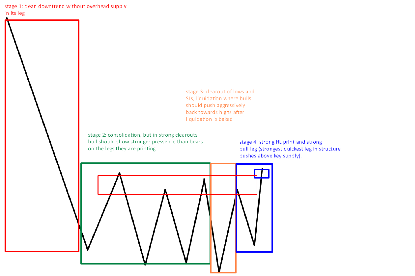 Core mechanics behind the setup is supply and demand shift within dense bottoming or topping structure. Traders should be looking to catch the squeeze when the key shift inside the structure happens. The squeeze initiated from the sup / dem shift could be the case of a large player absorbing on bid / ask a large number of orders to build a strong position and form the bottom/top on the asset, or the move could be the consequence of short squeeze that is initiated once major highs in the structure are taken out. For the most part, if either of the above is true, the setup should work pretty much straight away with minimal drawdown, if there is a substantial counter-move on the critical setup confirmation point, likely, dynamics for the setup are not there in the right magnitude, and the setup will fail. For that reason, those setups should be traded on relatively tight risk (relative to structure depth).