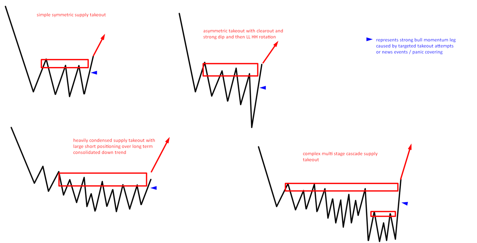 Several different versions of this setup will emerge in markets, based upon how the supply will be distributed inside the structure. The setups are presented for bullish plays mostly here, but the same goes for bearish setups just flipped upside down.