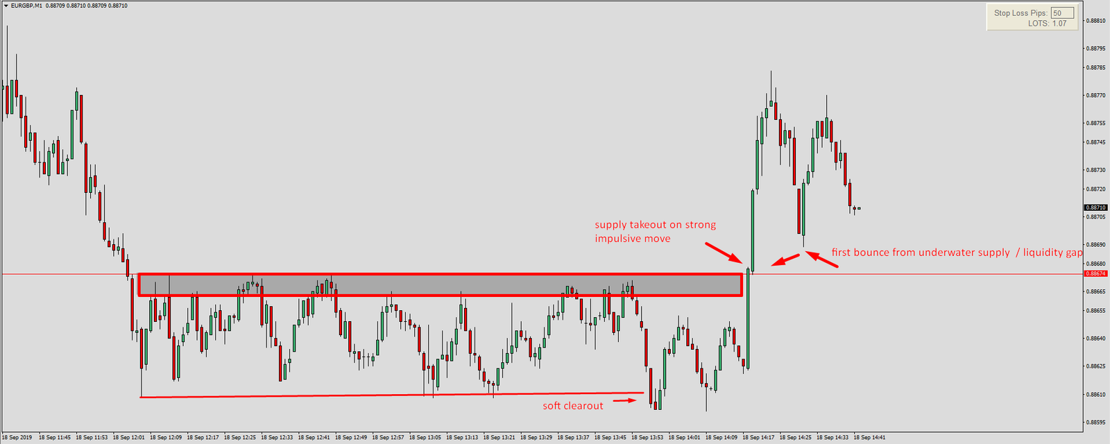 The image below is an example of demand takeout (as opposed to supply takeout) the same principles apply, just inversed. The structure below is very low-liquid which is not ideal, the lower the liquidity the easier can price overshot clean supply or demand levels.