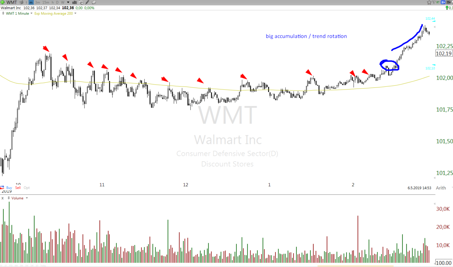Example of trend rotation or accumulation, followed by pressure into supply with higher lows, just before the price pushed higher on ticker WMT below.