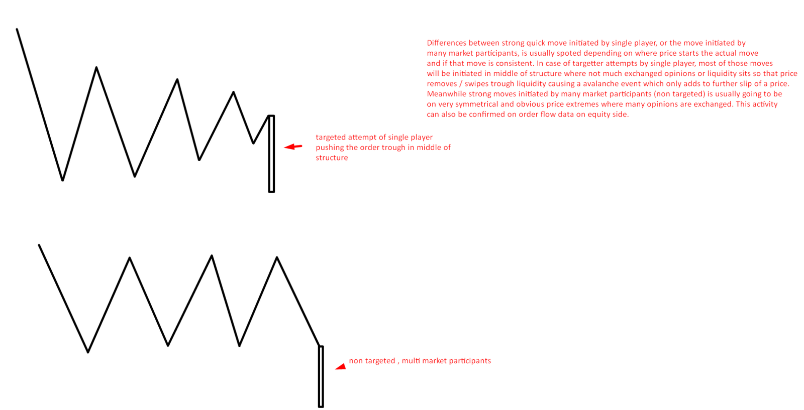 Larger players often cannot trade the same as the retail trader does because, in low liquidity price areas, they might push price too much with large orders and have a bad overall average on fills or have to fill a large number of orders with market orders since there is not enough limit book liquidity to fill them in. But that is not always the case as some market-making activity is actually created to push the price; both sides of the coin are present.