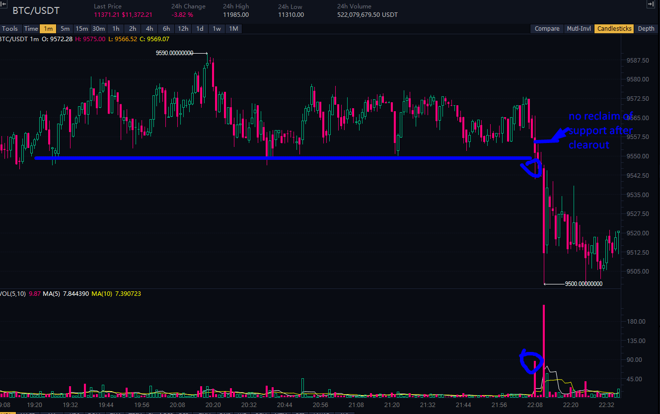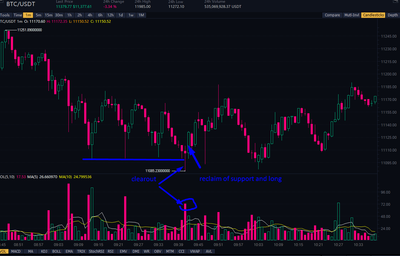 Below is an example with high volume clearout under lows as the long traders are stopped out, but the price did not reclaim the support level, thus not a long play. It was not a targeted attempt.