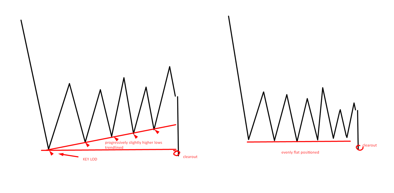 The example below indifference of flat vs. trendlined positioning of lows and the importance of deepest low (LOD). No matter how the structure is positioned, the low of the day (LOD) will be the key level that the market maker will want to clear out and where the majority of stops will likely sit.
