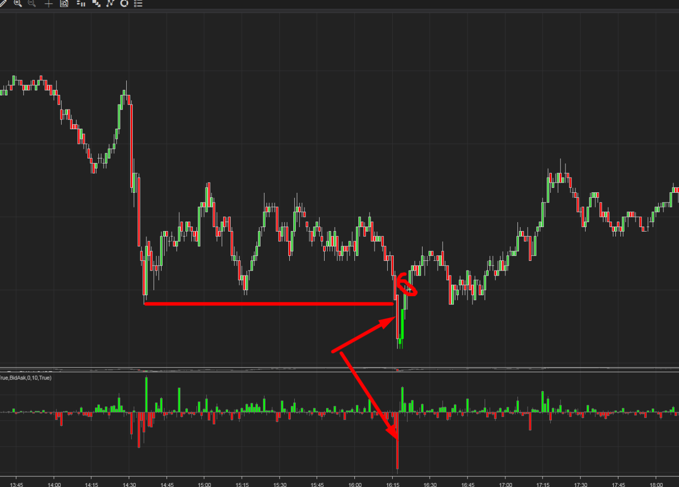 The volume prints on each candle will reveal when the longs will start to panic or where the actual stop losses are positioned, being patient and waiting for that high volume is key, and watching the speed of tape when offers start to flush big time. Still, the price actually starts to move up.
