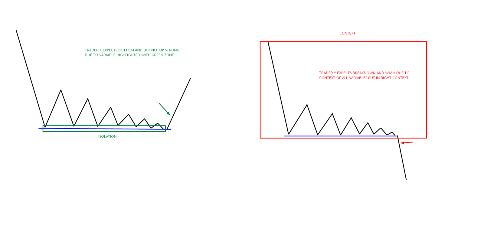 If variables are isolated an isolated type trader that would focus only on fact that price is bouncing from support might go long and expect very likely bounce, while trader putting it into right context would actually be more on the right side of edge. One trader not using context, vs other trader who does use context. Isolation vs context.