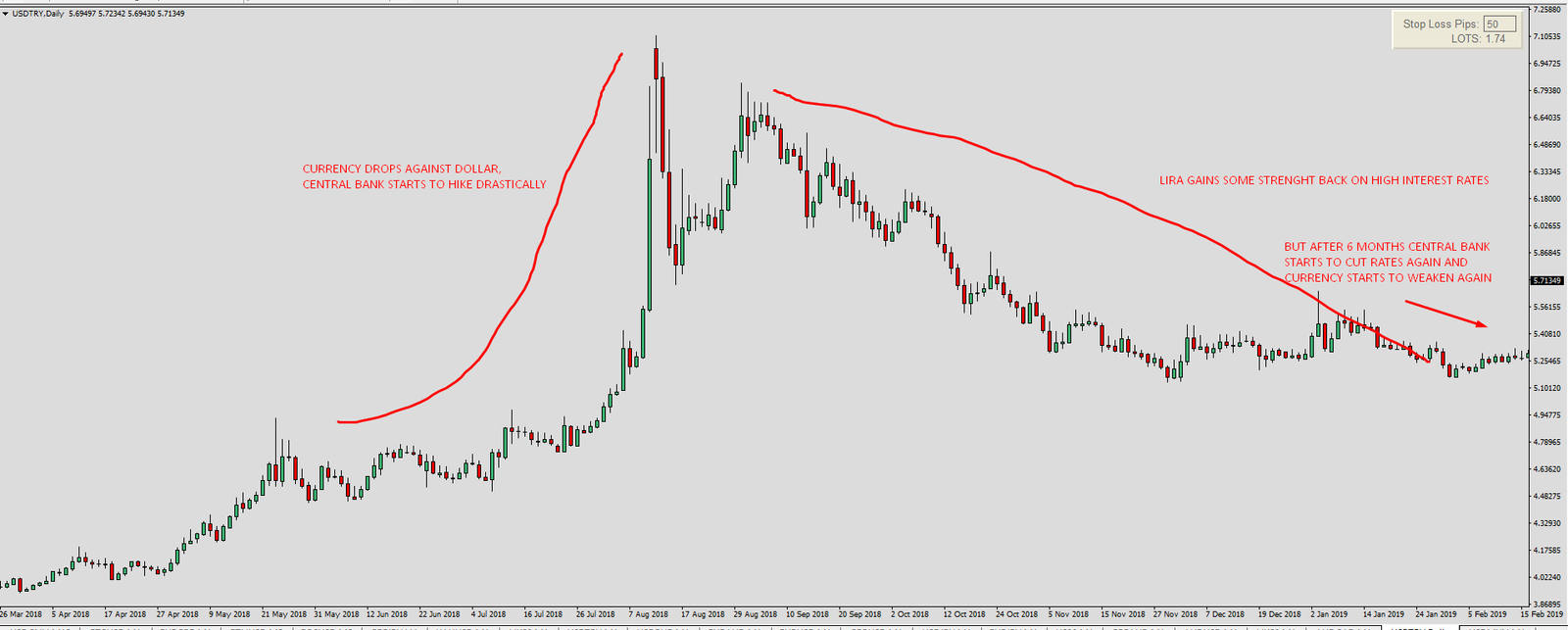 Bellow is example on USDTRY (Dollar versus Turkish lira) where the short term variable if isolated is very very strong: Emergency rate hike by 6%. If such variable is isolated, by itself is very strong and bullish for currency.
