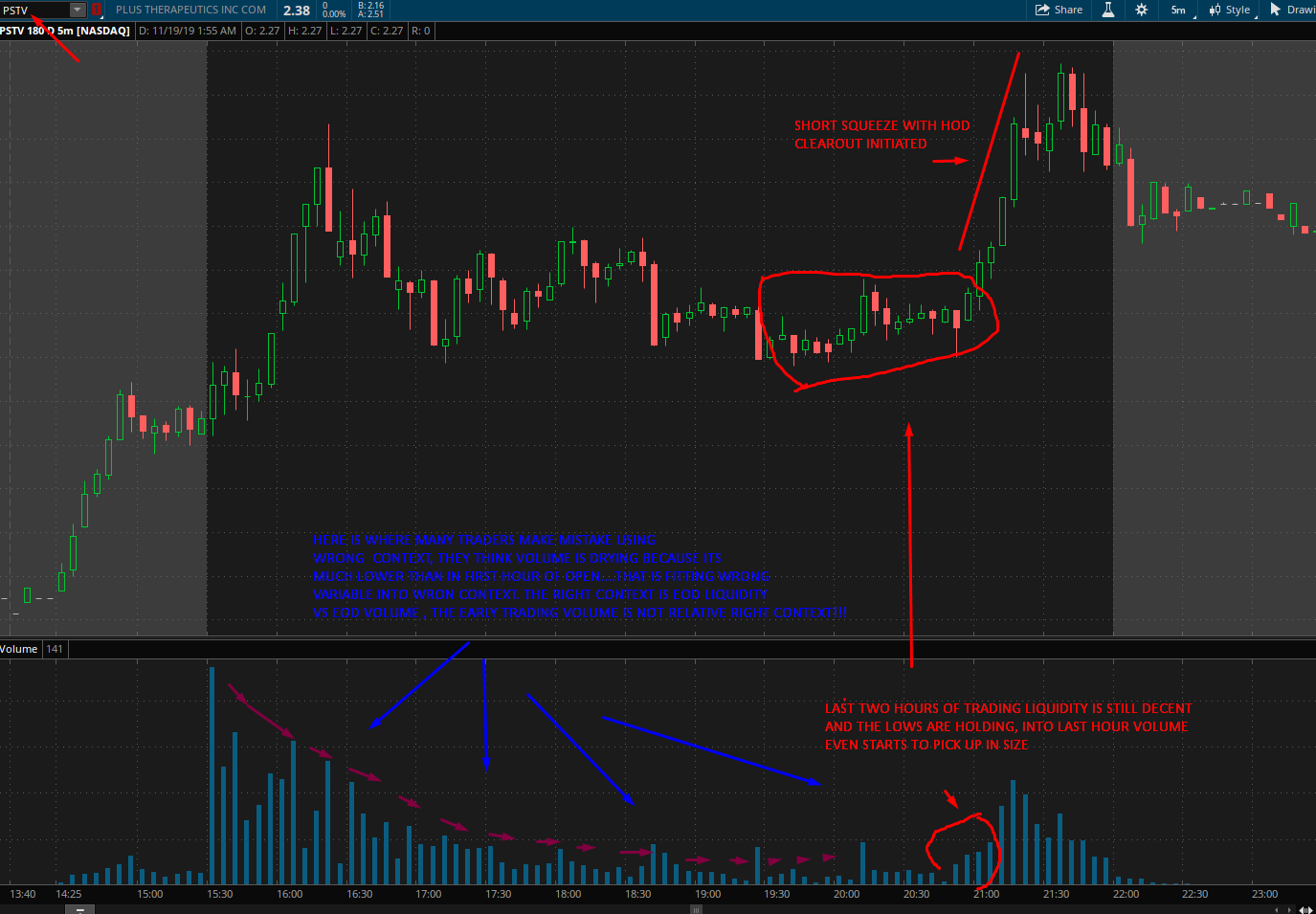 Example bellow also outlines something i often see in trading, is that traders simply pick wrong context! They are fitting or comparing variables that dont matter. For short squeeze play initial opening volume relative to EOD volume is not that important variable, there are other more important variables that signal potential variables and its proper context.