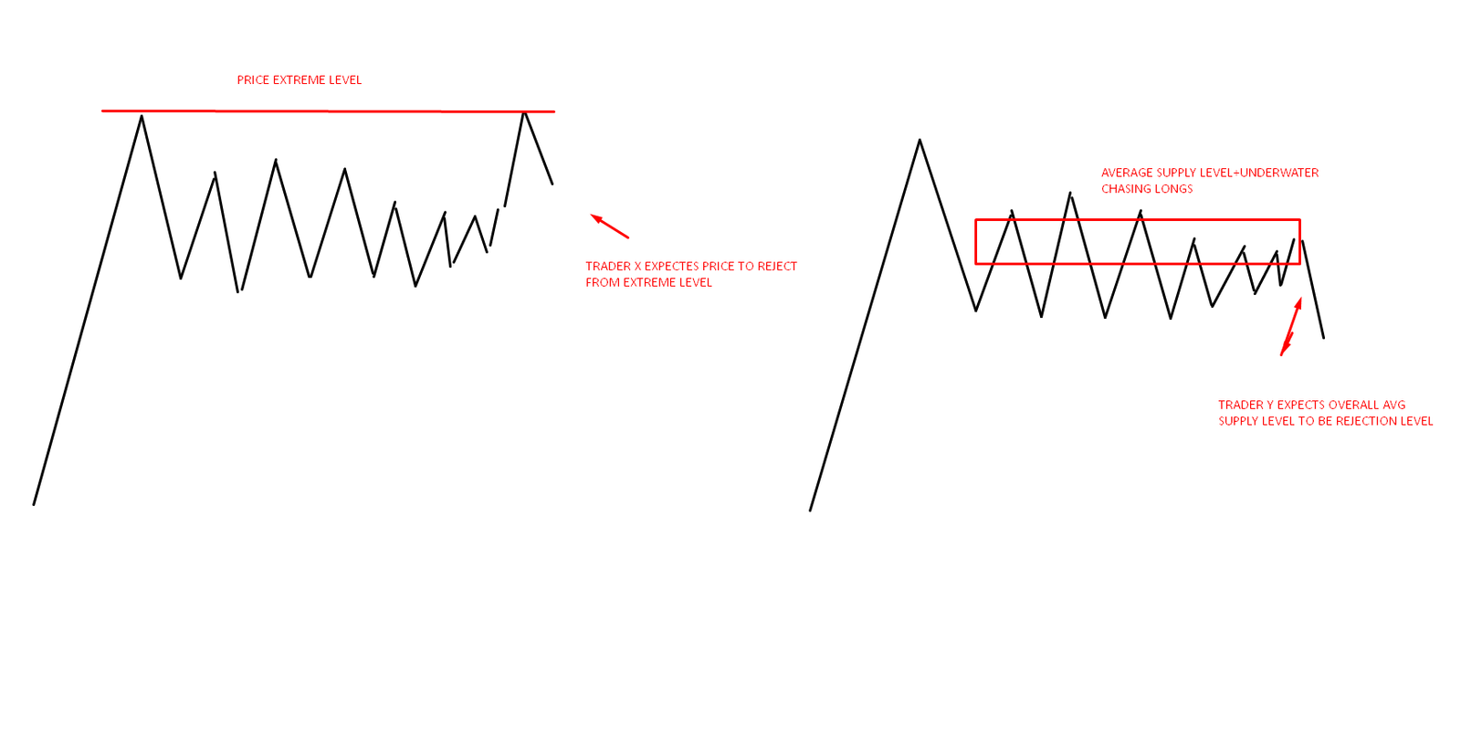 Instead when it comes to supports and resistances it is better to think of average volume based supply and demand on asset, rather than using price extremes to define potential rejection levels. Why? Because the fact that you are expecting rejection from extremes is a potential guess, while high volume average demand or supply area has underwater traders built in, that is not a guess but rather more a fact. Trading facts is always better than trading speculations.