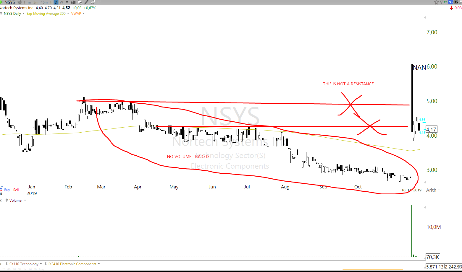 Bellow is example of ticker where historical levels are meaningless to plot, especially considering that asset has putted heavy volume (float rotated) in pre market and all the historical action is much older than 1 month (NSYS and EYEG):