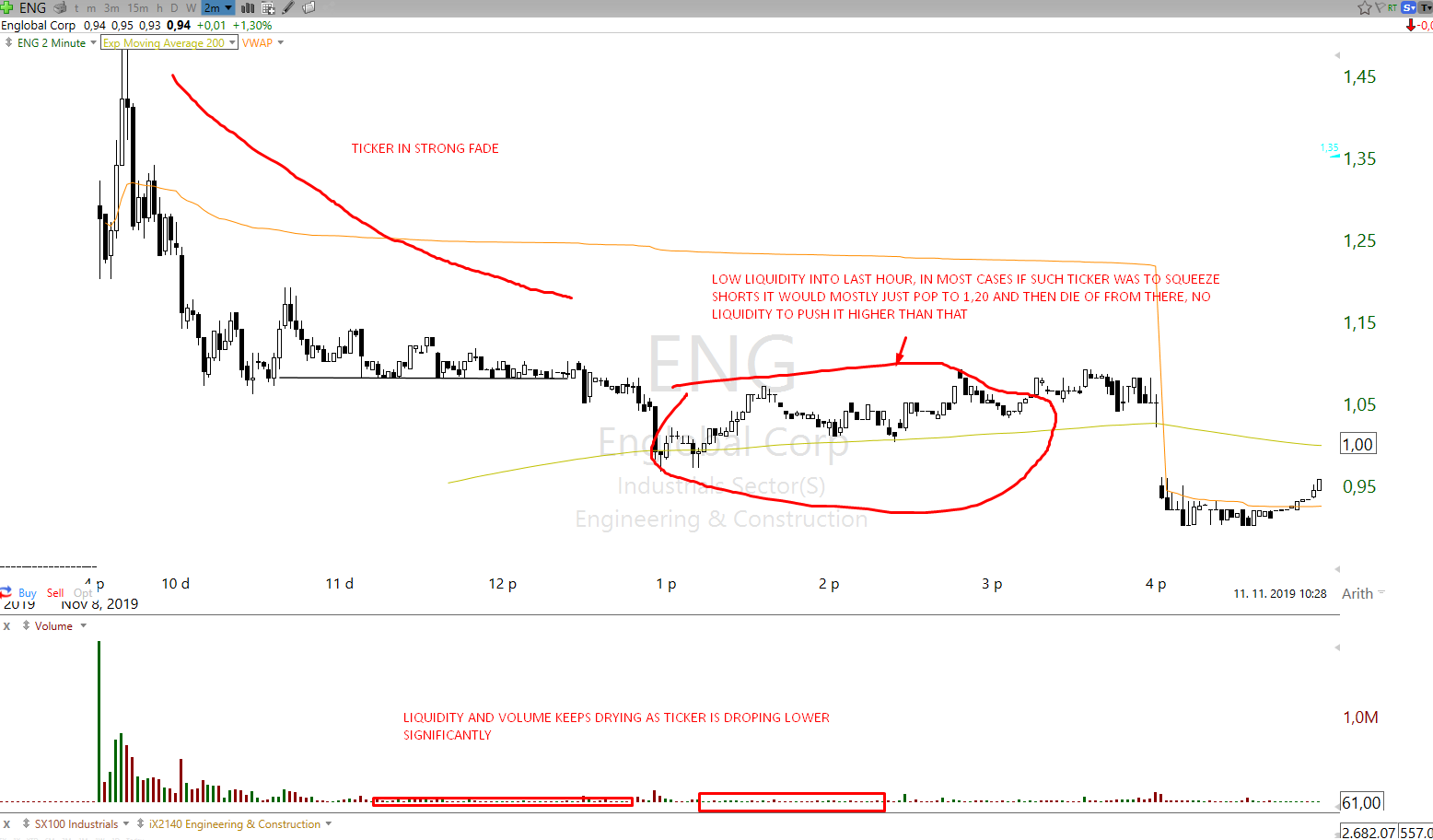 And bellow is example of ticker that had no strong liquidity towards late hours and was no longer up much % on a day, in such environment it is harder for riggers to squeeze shorts as it posses too much risk and too much capital needed to fight offers from underwater longs. Thus in low liquid EOD conditions there is lower chance of short squeeze on microfloat stock.