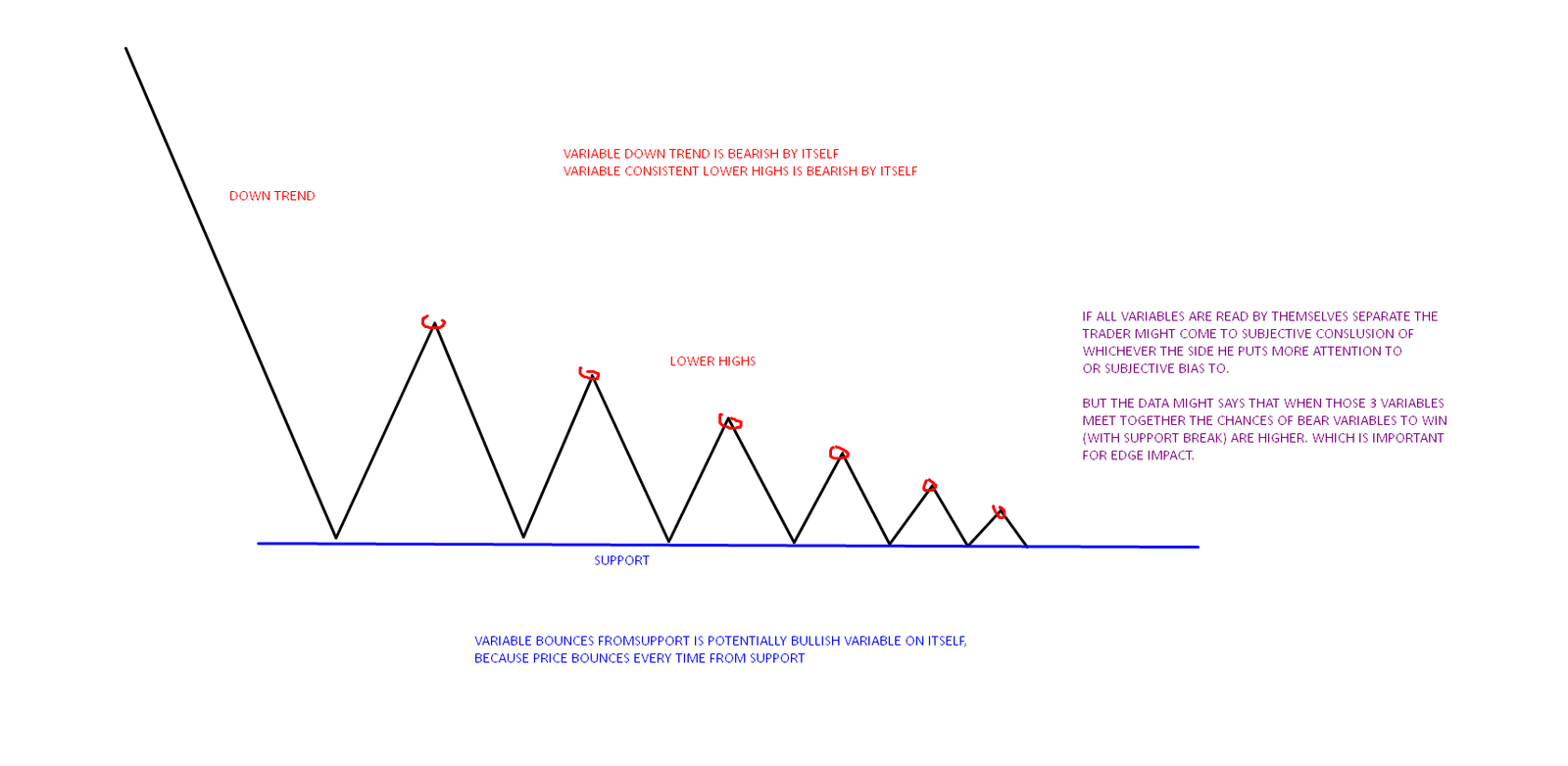Bellow is example of distribution structure (tape and micro details were excluded for simplicity reasons). This might be example where if traders are isolating variables too much they might come with wrong conclusions long term over 100 repetitions. A trader that would just ignore bearish or context picture, and only focus on the fact that price is bouncing from support as being “bullish” would miss the overall big picture of macro context and thus trade against the odds. That is why using context is very important, fitting variables into eachother or linking them together, never isolating single variable on its own and drawing conclusion from that. Always remember if you do not use context or data in trading, you will eventually see what you want to see in trading, and what you want to see might be slightly untrue or in some cases complete illusion .